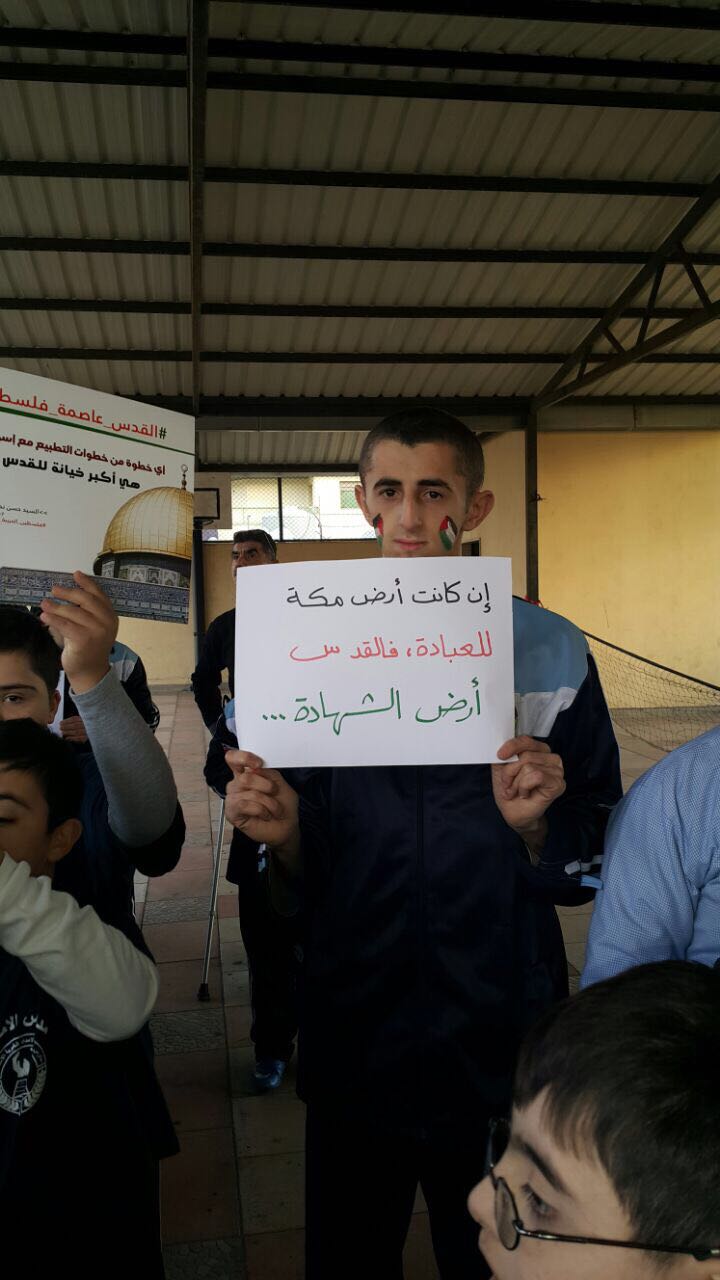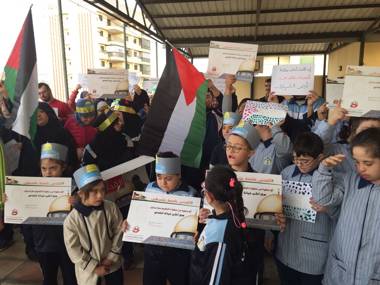 وقف طلاب مركز الإمداد للتربية المختصة - بيروت - زقاق البلاط وقفة تضامنية مع القدس الشريف إستنكاراً لقرار ترامب الأميركي بجعله عاصمة للكيان الصهيوني الغاصب، حيث حمل التلامذة اليافطات والشعائر الخاصة بالقدس والعلم الفلسطيني وهتفوا "للقدس رايحين شهداء بالملايين"، خلال الفترة الصباحية.