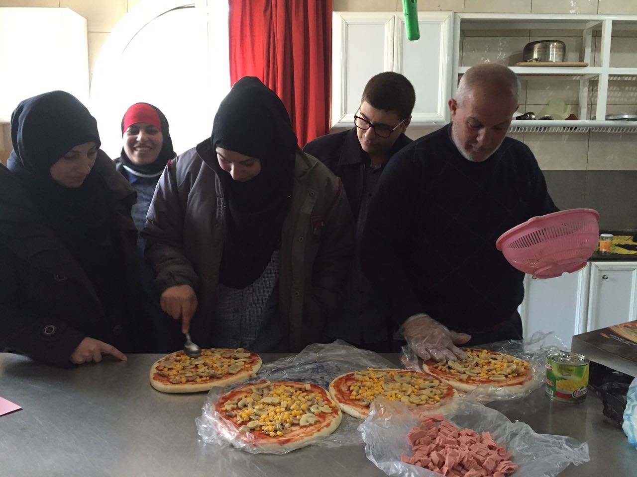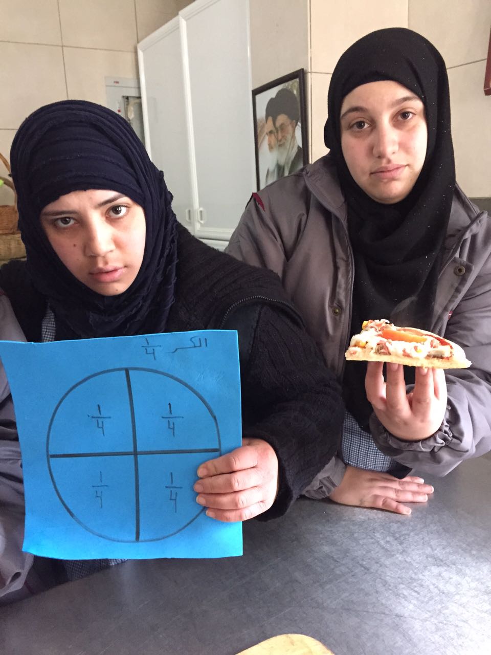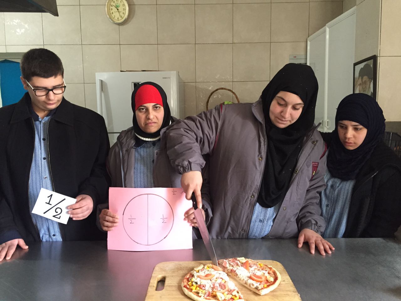 تعميماً لأهداف مادة الرياضيات محور الكسور قام صف المشغل المحمي (الخاص بالفتيان والفتيات ذوي الحاجات الخاصة) بإعداد البيتزا وتقسيمها إلى نصف وربع بحسب البطاقات الموجودة معهم ومن ثم تناول البيتزا..
