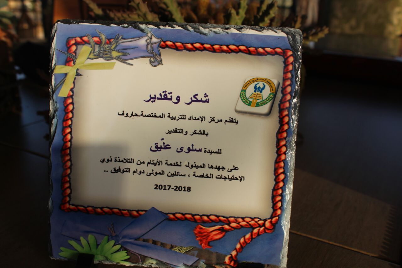 لمزيد من التعاون الخيري، التقت إدارة مركز الإمداد للتربية المختصة - حاروف، السيدة سلوى عليق في بلدة يحمر الشقيف لشكرها على جهودها في خدمة ذوي الحاجات الخاصة والأطفال الأيتام الذين ترعاهم الإمداد. وبعد اللقاء قدم وفد المركز لوحه تذكارية من إنتاج التلامذة كعربون شكر وتقدير للسيدة عليق على خدماتها عطاءاتها الكريمة...