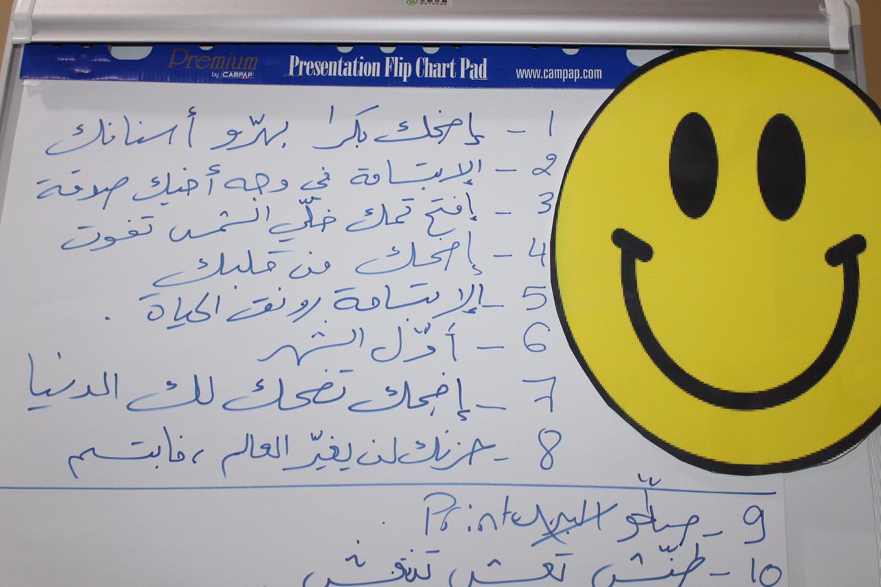 تعريف الابتسامة وأسبابها، عصف ذهني (عبارات عن الابتسامة مع هدية لأجمل عبارة)، عرض فيديوهات عن الابتسامة، فقرة ترفيهية لأستاذ المسرح. اختتم النشاط بأسئلة وهدايا للفائزين بالإضافة الى تناول الحلوى التي صُمّمتْ على شكل وجوه مبتسمة، في أجواء تفاعلية مبتسمة.