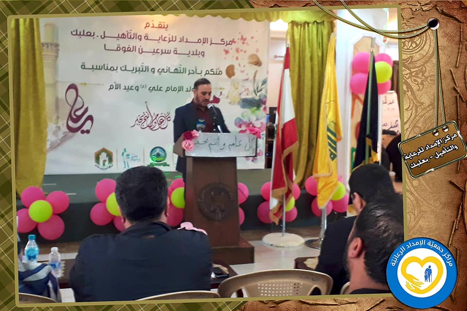 برعاية رئيس بلدية سرعين الفوقا الحاج عطريف شومان، وبالتعاون مع التعبئة التربوية وجهاد البناء في البقاع، وبحضور مدير جمعية الإمداد في بعلبك الحاج أبو ياسر نون، وعدد من الفعاليات التربوية والبلدية والإجتماعية وأهالي التلاميذ، وفي أجواء ذكرى مولد الإمام علي (عليه السلام) وعيد الأم والطفل، أقام مركز الإمداد للرعاية والتأهيل - بعلبك إحتفالًا في المركز، تخلّله: