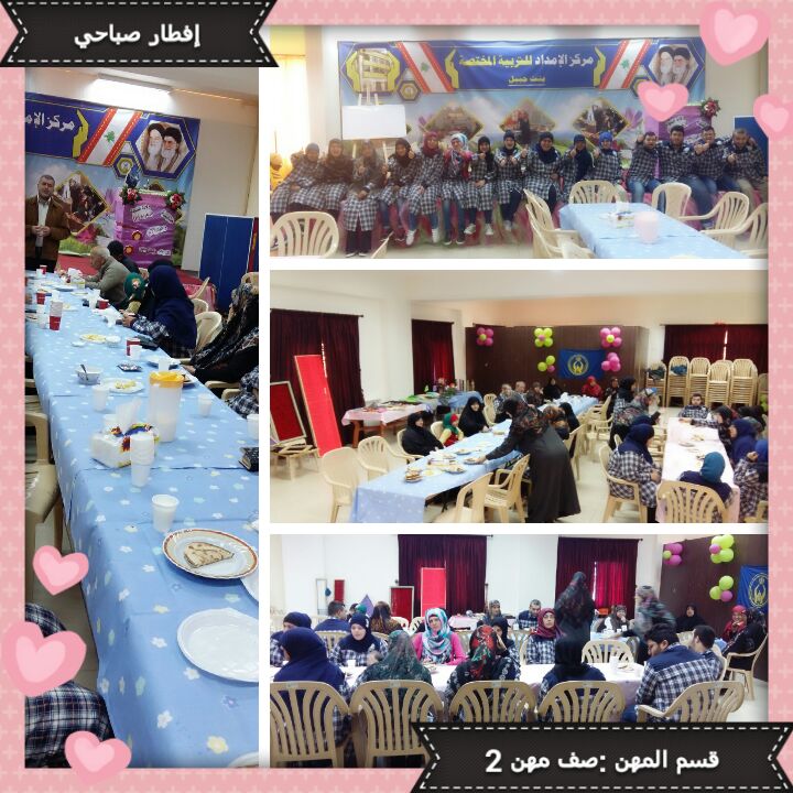 تقديراً للجهود المبذولة في المعارض التي أقامها مركز الإمداد للتربية المختصة - بنت جبيل، في كل من مدارس المهدي (عج) ومعهد الآفاق، تم تكريم تلامذة صفي المهن وذلك بإقامة فطور صباحي في المركز جمع التلاميذ وآباءهم ومربيات الصفين والتنسيق، كما تم اصطحاب التلاميذ في نزهة إلى حرج يارون.