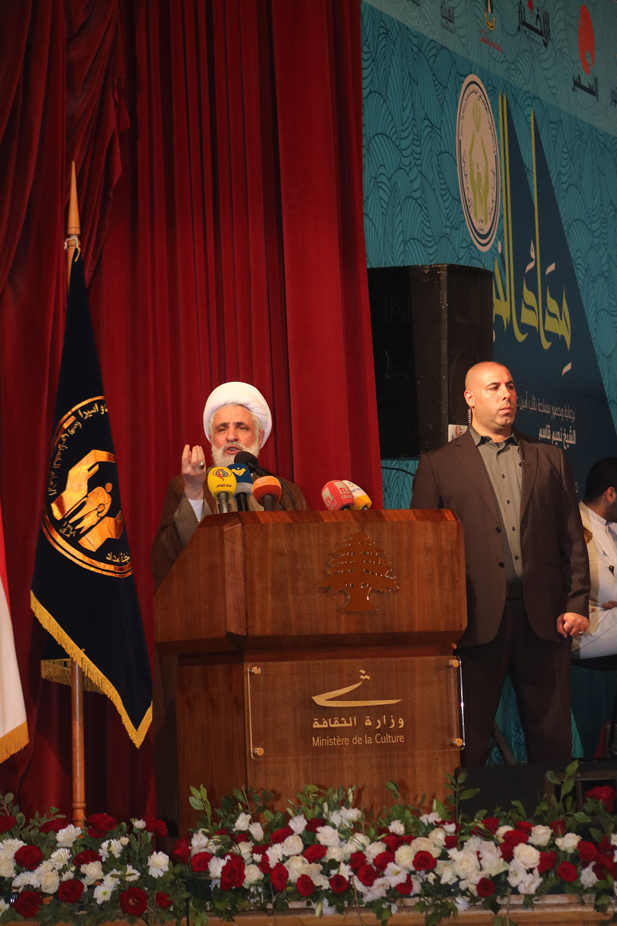 الشيخ قاسم: وقبل الختام كانت كلمة لراعي الحفل نائب أمين عام حزب الله قال فيها: "أحيي لجنة إمداد الإمام الخميني على عطاءاتها ودورها وأدائها الذي بلسم الجراح وأعان الشباب والشابات وكذلك الأطفال والأهل ليعيشوا حياة كريمة عزيزة ترفع الرأس عالياً وتبشر بنتائج خيرة في هذه الحياة الدنيا. من أهم ما أنجزته لجنة إمداد الإمام الخميني في لبنان أنها أشعرت العائلات بالعزة والكرامة وأن الفقر ليس عيباً وليس نقطة سلبية في حياة الإنسان فهو ابتلاء واختبار وامتحان وإنما الفقير الذي يكون فقيراً بعقله وأهدافه ومستقبله أما أنتم فأغنياء العقول والحاضر والمستقبل". ثم خاطب الطلاب الناجحين قائلاً: "أنتم اليوم نجحتم في العلم الأكاديمي لكن أهميتكم أنكم تحمون المقاومة وتؤمنون بها وتؤيدون تحرير الأرض وتتعاطفون مع هذه المسيرة وتحملون لواء مواجهة اسرائيل فأنتم ناجحون مرتين، مرة في الامتحانات الرسمية ومرة أخرى بهذا الاتجاه النبيل الشريف لتحرير الأرض والإنسان. لقد أثبتّم أن الفقر لا يمكن أن يكون عقبة طالما هناك من يعمل على التكافل الاجتماعي والتضامن والعمل المشترك". وأضاف: "هؤلاء الذين يعملون ليستثمروا في علاقتهم مع الله تعالى هم الخير وهم البركة وهم التوفيق فبارك الله في جمعية إمداد الإمام الخميني (قده)". ثم تطرق للوضع السياسي الراهن قائلاً: "لو لم يضح شباب مقاومة حزب الله في جنوب لبنان والبقاع الغربي، لما خرجت إسرائيل من لبنان، لو لم يضحِ هؤلاء الشباب هل كان يمكن أن نسجل نصر أيار سنة 2000، لو لم يضح هؤلاء الشباب هل كان يمكن أن نهزم إسرائيل سنة 2006 ويشهد لنا العالم بأننا في الموقع العزيز المستقل الذي لا يقبل أن يكون مطيَّة لأحد أو تحت سيادة أحد، لا حماية للبنان إلاَّ بالتوكل على الله تعالى وبنادق المقاومين، وستبقى هذه البنادق حاضرة لتواجه وتحرر وتحمي لتردع إسرائيل مهما كانت إسرائيل وارتفعت ستسقط إن شاء الله تعالى ببركة المقاومة. لو لم تتم مواجهة التكفيريين من بوابة البقاع من حدود لبنان الشرقية مع سوريا، أين كان هؤلاء؟ كانوا دخلوا إلى قرى البقاع وأقاموا إمارات تكفيرية في البقاع والشمال، وبدأوا بتصدير المنتج الوحيد الذي يعرفونه وهو السيارات المفخخة، ودخلت السيارات إلى لبنان من أوله إلى آخره، نعم إلى الجنوب وإلى صيدا وإلى بيروت وإلى جونية وإلى طرابلس وإلى الضاحية وإلى كل مكان. كنا نسمع البعض يقول بأن هؤلاء لا يقصدوننا ولا يريدوننا نحن، أعتقد بعد اعتقال أمير داعش في لبنان من قبل الجيش اللبناني - مشكورًا ومأجورًا - عرَّف الناس تمامًا أن استهدافهم للجميع من دون استثناء. كيف كان وضع لبنان لولا هذه المواجهة التي حصلت، ولولا هذا القتال وهذه التضحيات وهذا النبل الذي قدمه شباب المقاومة وضحوا بأنفسهم من أجلنا ومن أجل وطننا وأطفالنا ومن أجل أن ننجح في مدارسنا، ومن أجل أن نعيش في بيوتنا، فلولا هؤلاء في مواجهة التكفيريين لكانوا يفجرون في كل يوم ويقتلون في كل شارع، ولكن خسئوا ببركة هؤلاء المقاومين المجاهدين الذين واجهوهم في ديارهم. نظَّروا علينا كثيرًا، وقالوا لا نريد أن نورط لبنان في أزمة المنطقة، من يورط لبنان؟ التكفيريون يورطون لبنان، وأمريكا تورط لبنان، والسعودية تورط لبنان، أسجل بكل جرأة أنه لولا حزب الله القوي القادر المصمم الذي يريد للبنان الاستقرار وحمى الاستقرار ومنع الفتنة وتحمل المصاعب وقاتل إسرائيل من جهة والتكفيريين من جهة لما كان هناك استقرار في لبنان، وأشهد أن أمريكا والدول الأوروبية يريدون استقرار لبنان، من أجل أن يكون مركزاً للجوء السوري كي لا يذهب النازحون السوريون إلى أوروبا وبلدانهم، أي يريدون لبنان مستودعًا للنزوح بعد أعمالهم البشعة في قتل الشعب السوري، شتان بين هدف حماية لبنان وما نقوم به وبين جعله مستودعًا للنازحين ومسرحًا لأطماعهم وقتلهم ومؤامراتهم. ليكن واضحًا: التعامل مع لبنان الوطن يتطلب تضحية، أما لبنان المغانم فلن يصمد، والذي يحاول البعض أن يأكل منه وأن يسلبه 