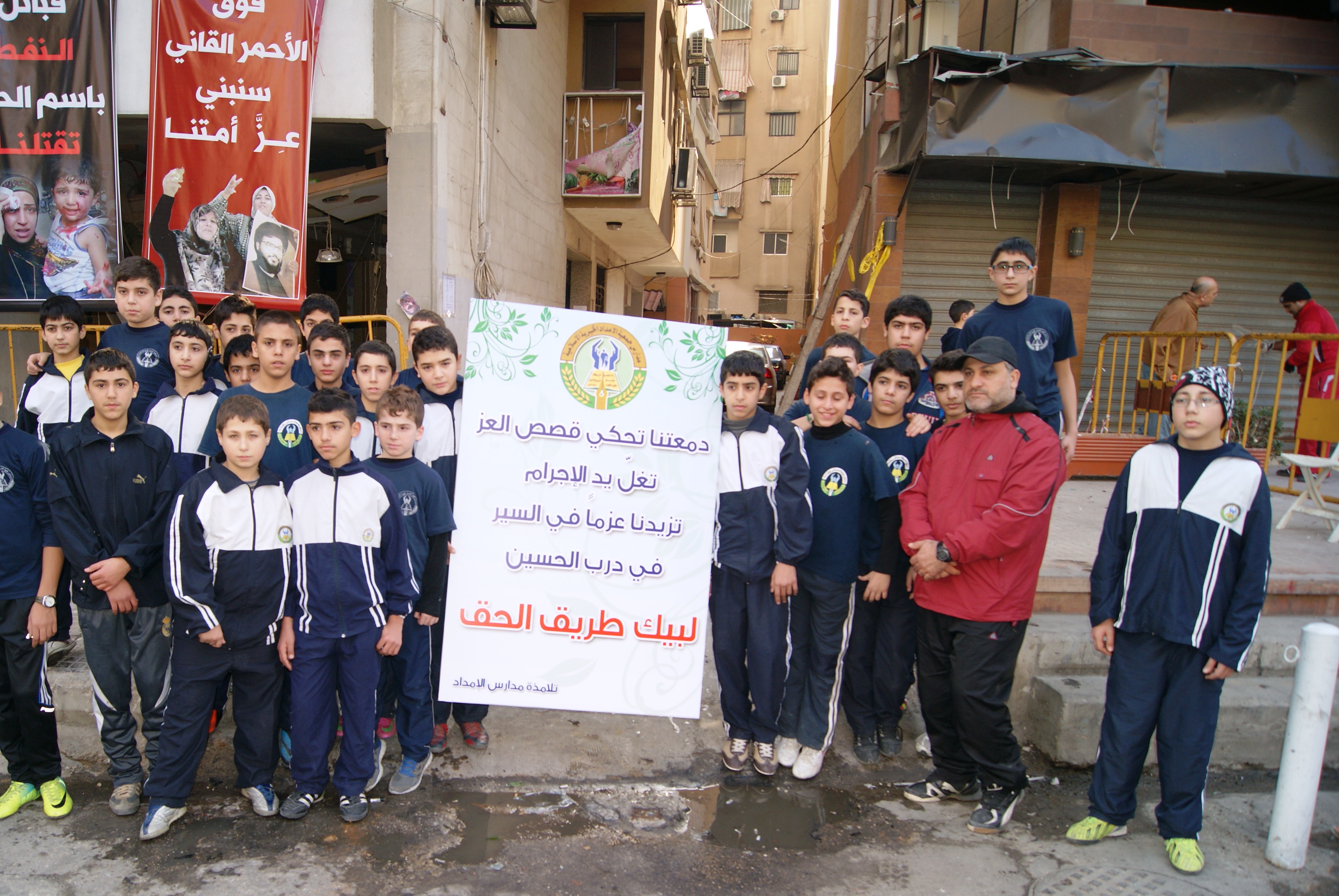 إستنكاراً للتفجير الإرهابي الآثم الذي استهدف الأبرياء في الضاحية الجنوبية، وتكريماً لزملائهم الشهداء قام وفد طلابي من ثانوية الإمام الخميني (قده) برفقة الهيئة التعليمية بزياره موقع التفجير في حارة حريك و علقوا لوحة تندد بالعمل الإرهابي الجبان ؛ كما قدم الوفد برفقة مدير عام جمعية الإمداد الحاج محمد برجاوي واجب العزاء لرفاقهم في مدرستي الكوثر والمصطفى (صلى الله عليه وآله) ولذوي الشهداء المظلومين ملاك زهوي وعلي خضرة، وختموا جولتهم بوضع إكليل من الورد على أضرحة الشهيدين.