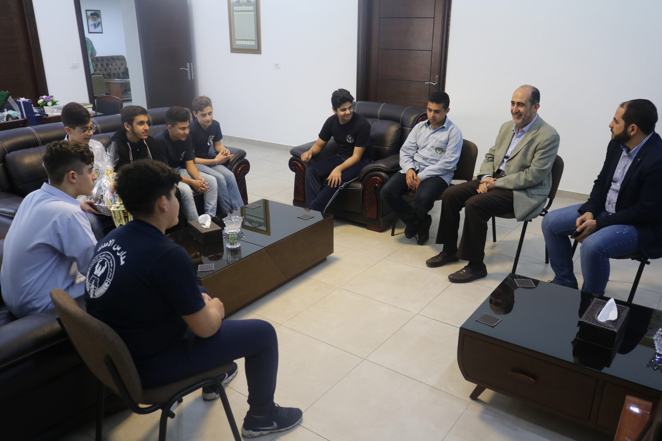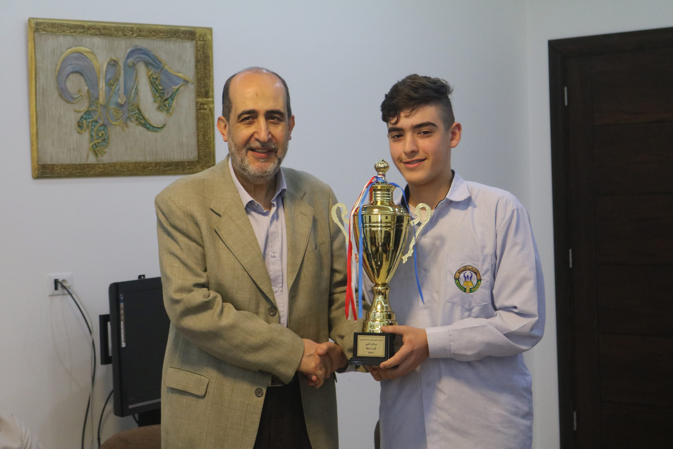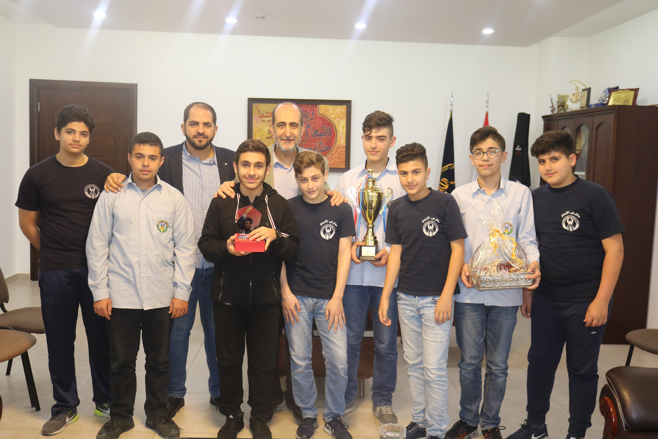 طلاب مدرسة أهل البيت (ع) - بيروت - زقاق البلاط يقدمون كأس المركز الثاني في بطولة السيد هادي نصرالله في كرة السلة لمدير عام جمعية الإمداد الحاج محمد برجاوي.