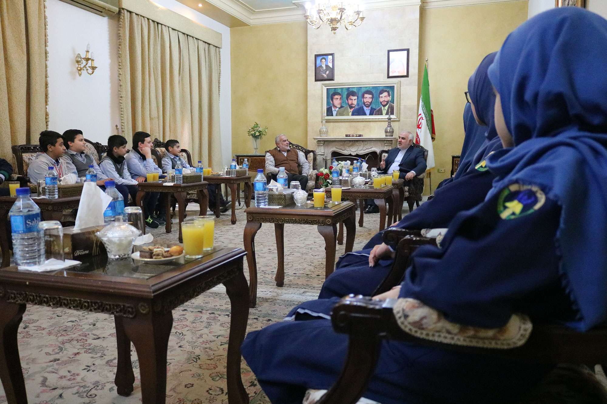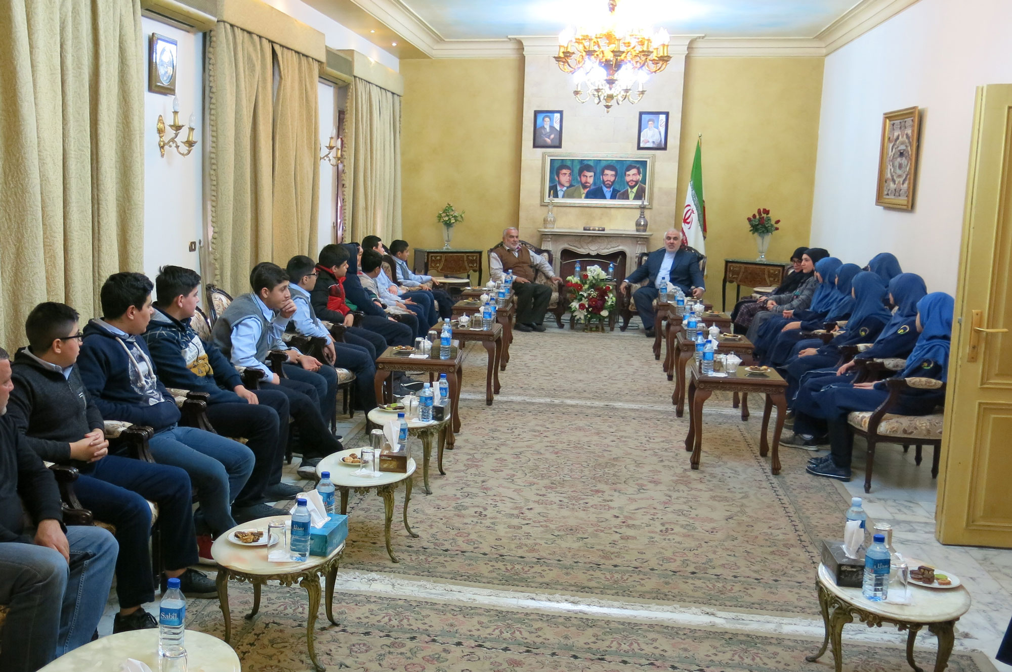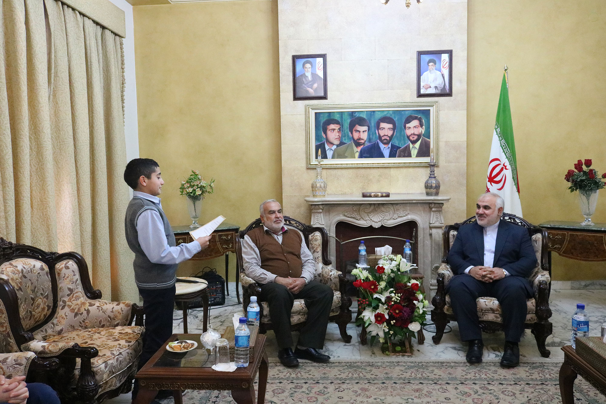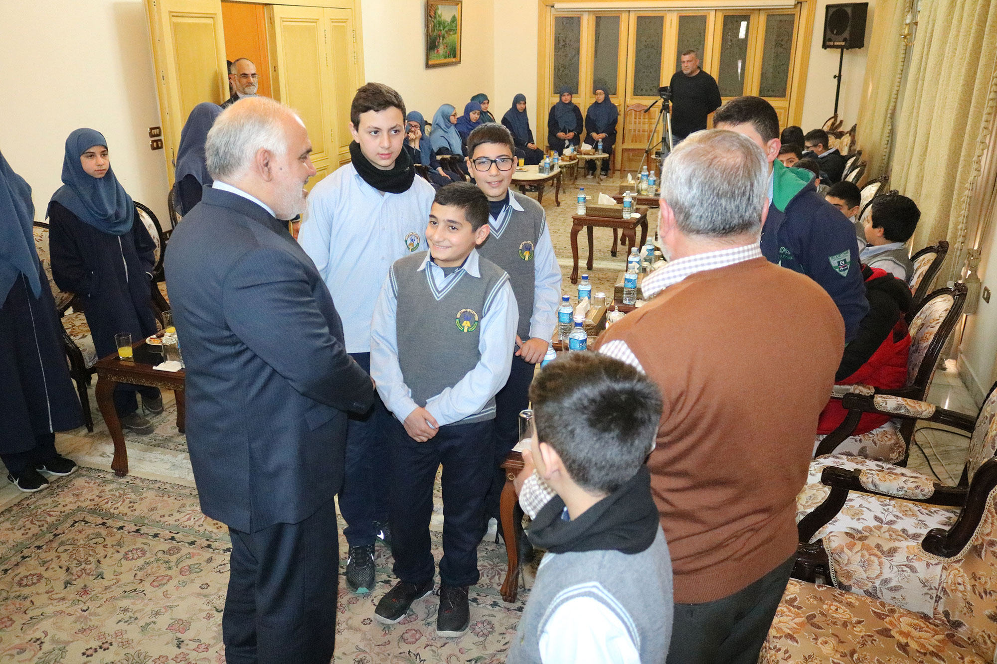 قام وفد من طلاب ثانوية الإمام الخميني (قده) - الحدت - بيروت، ضم الناظر العام وعدداً من المعلمات و30 طالباً وطالبة من الحلقة الثالثة، بزيارة سعادة سفير الجمهورية الإسلامية الإيرانية في لبنان السيد محمد فتحعلي في دار السفارة، وذلك لتقديم باقة من الورد والمعايدة بالذكرى 39 لانتصار الثورة الإسلامية في إيران، وألقى الطالب أحمد أيوب نجل الشهيد مصطفى أيوب كلمة معبرة بالنيابة عن الوفد وجميع طلاب الثانوية.