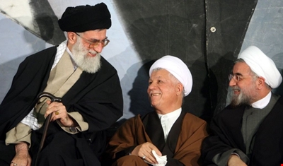 من اليسار إلى اليمين: السيد علي الخامنئي (دام ظله)، آية الله علي أكبر هاشمي رفسنجاني (ره)، الرئيس الإيراني روحاني