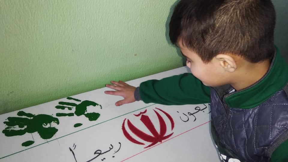 - تشكيل علم الجمهورية الإسلامية الإيرانية بأيدي الأطفال باستخدام الالوان.